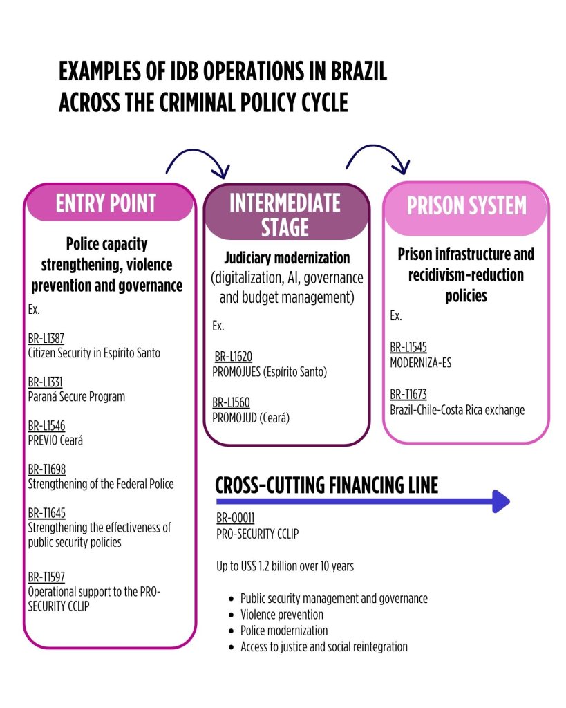The portfolio of the Inter-American Development Bank (IDB) in Brazil, focused on security and justice projects, illustrates how investments are distributed across different stages of the criminal policy cycle.