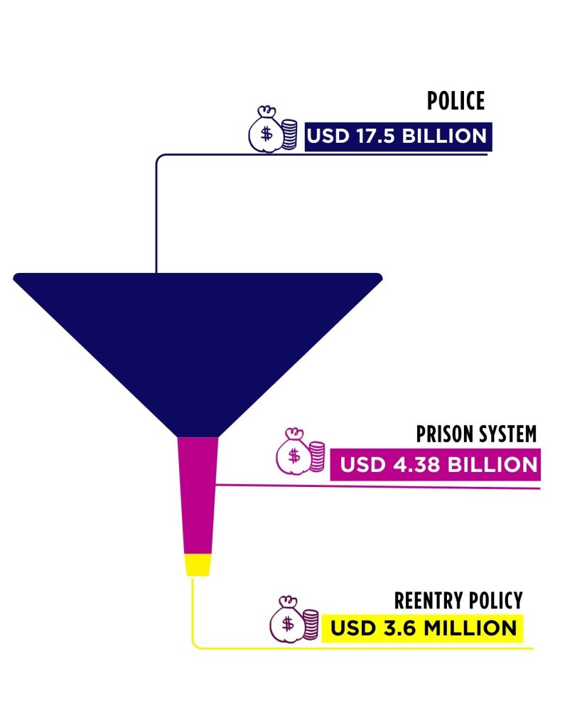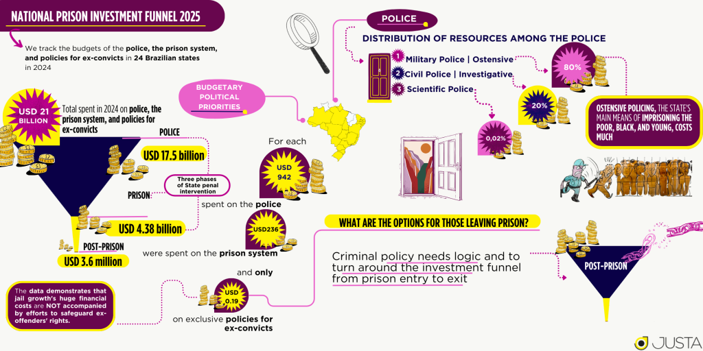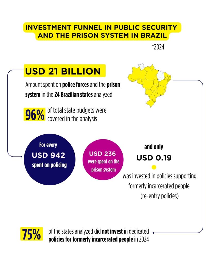 The analysis reveals a budget allocation model that concentrates resources at the entry point of the criminal justice system (policing). At the same time, it sustains investment in a prison system where basic rights violations have been recognized by the Supreme Federal Court, while leaving virtually no opportunities for people leaving prison.